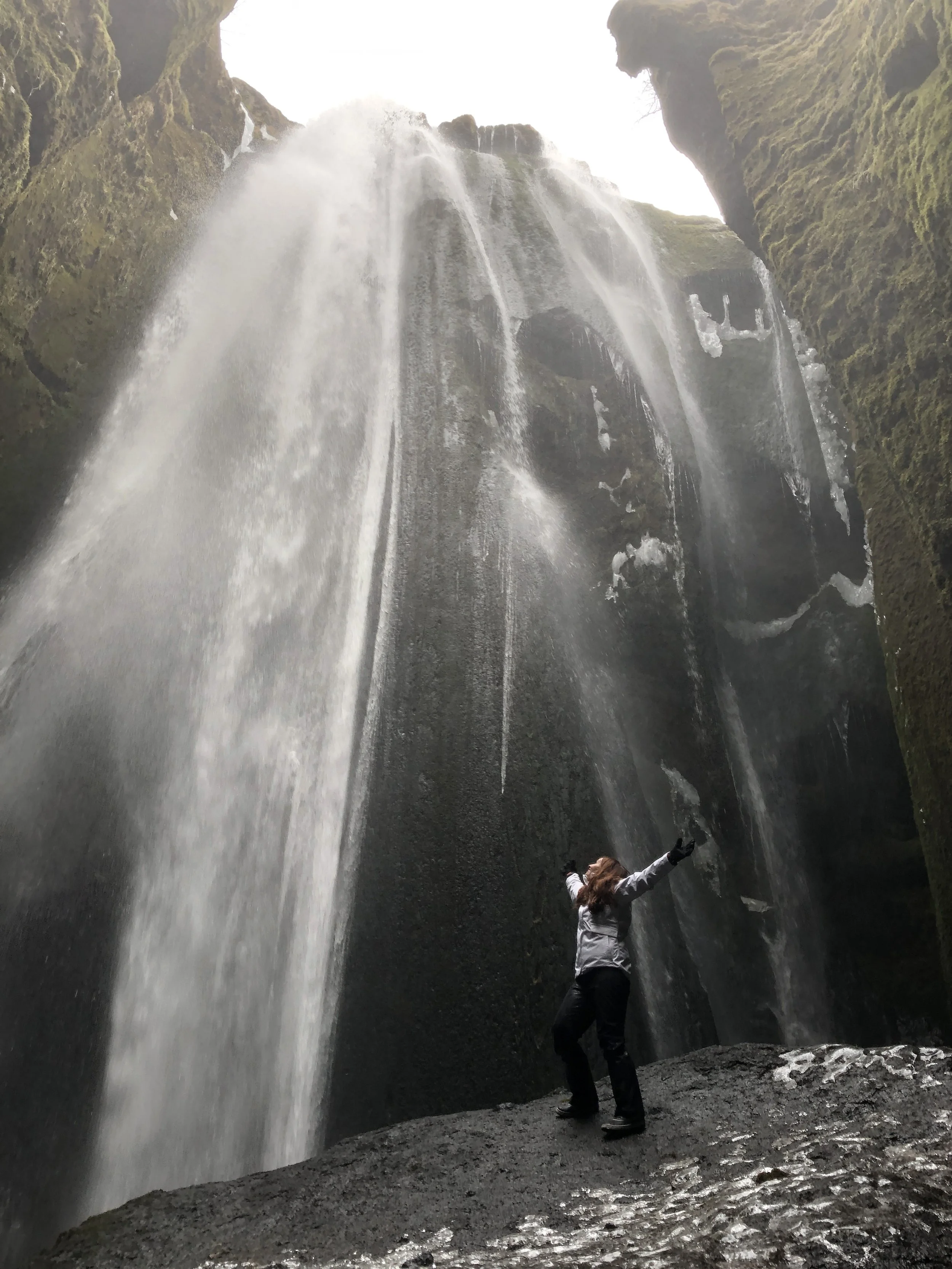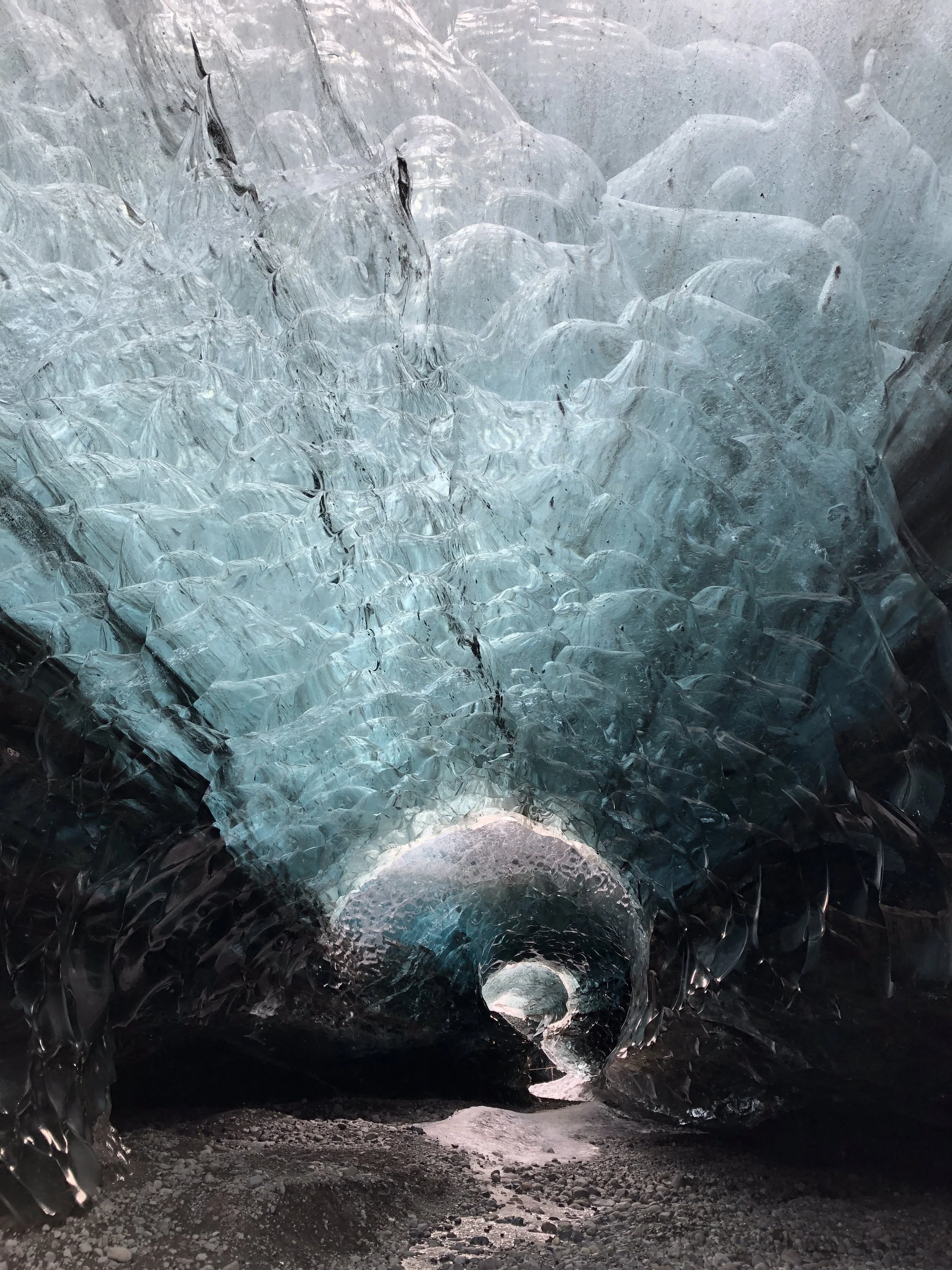We walked next to a frozen waterfall, waded through a small river to a magical one in an open-air cave, skated in our boots in front of another frozen beauty, and that was just Day Two. Visiting a lagoon filled with icebergs, the sea where they eventually float out to, and then climbing the glacier that created them wowed us on the following days. Our six-mile glacier hike took us to astoundingly beautiful ice caves (#22), carved by wind and water. And we still weren’t done with Iceland’s beauty.